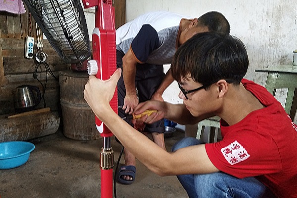 “我们家灯坏了很久,不知道能不能修?”一位老爷爷问道,志愿者赶紧迎上去,扶老爷爷坐下,随后对坏掉的灯进行了检查与维修,老爷爷看着亮起的灯泡,对他们表示了的感谢。即使早已汗流浃背,也冲刷不了志愿者们的热情,他们的敬业赢得了村民们的赞扬。